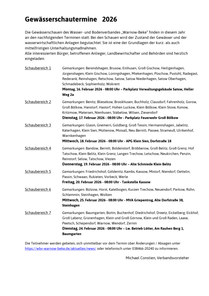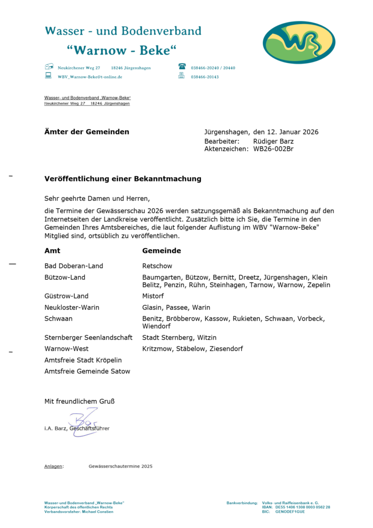 Bekanntmachung Wasser- und Bodenverband „Warnow-Beke“ Gewässerschau 2026